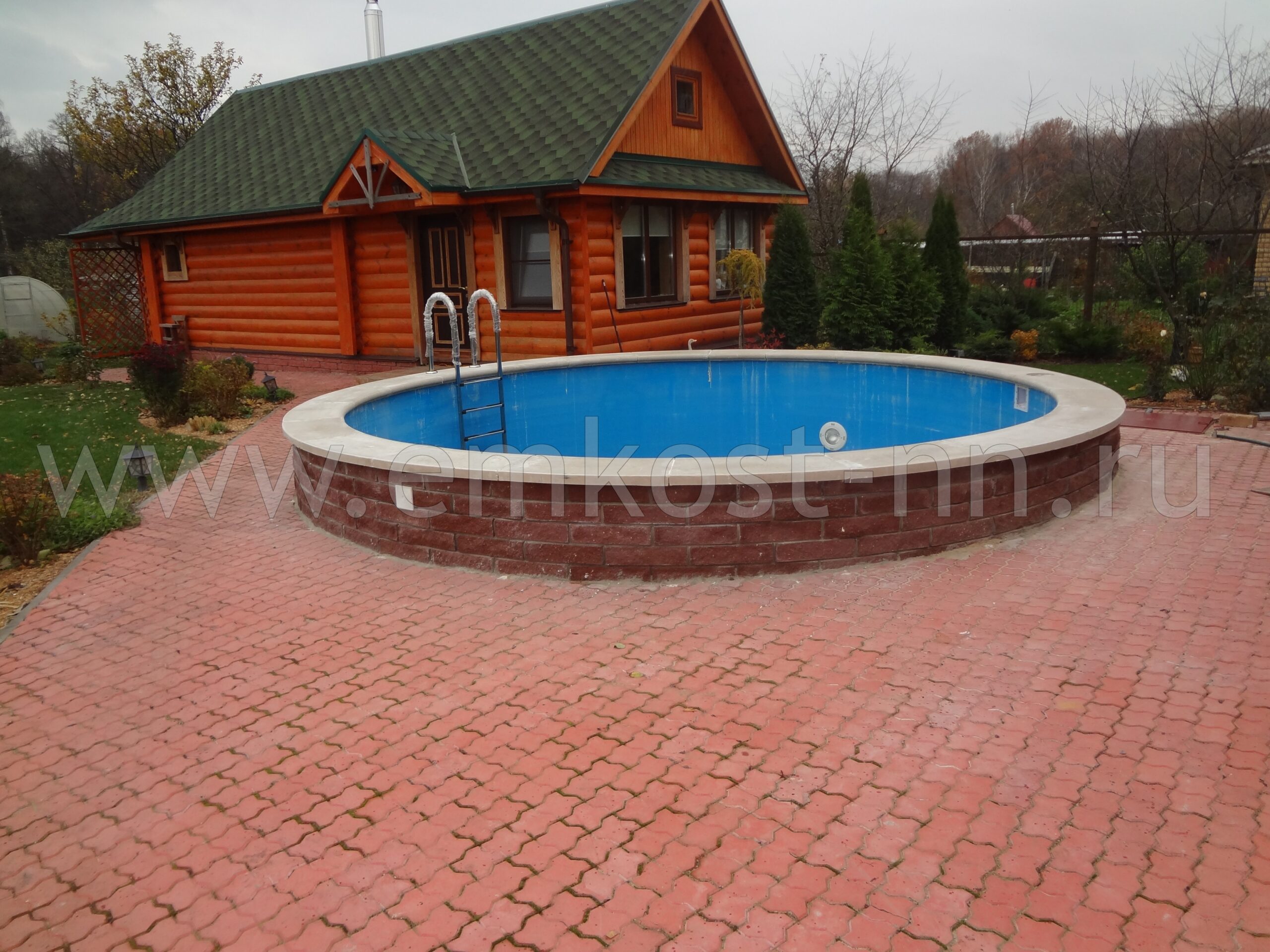 Заказчик из Владимира хотел установить стационарный бассейн на загородном участке. Требования: круглая форма, диаметр ~5,5 метров, глубина 1,5 метра, встроенная лестница.